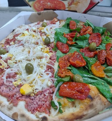 A pizza de calabresa no forno a lenha é simplesmente irresistível, sempre quentinha e saborosa!